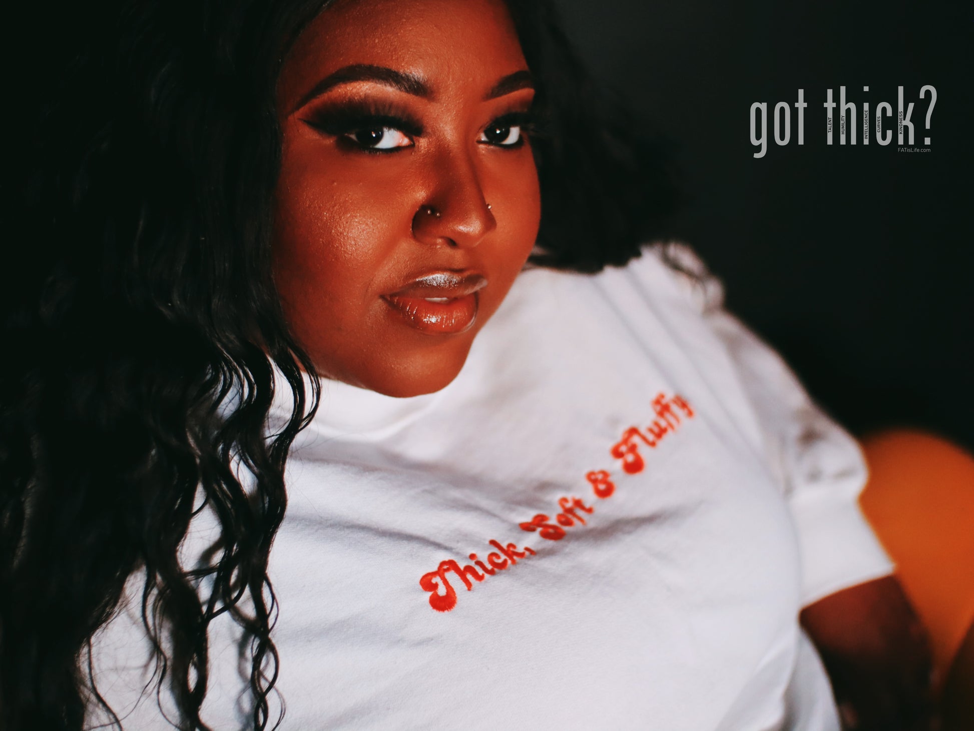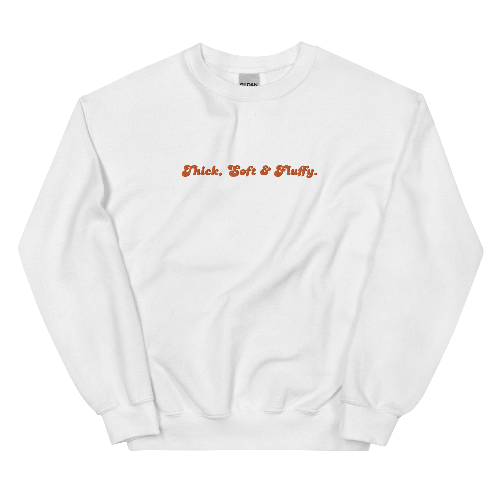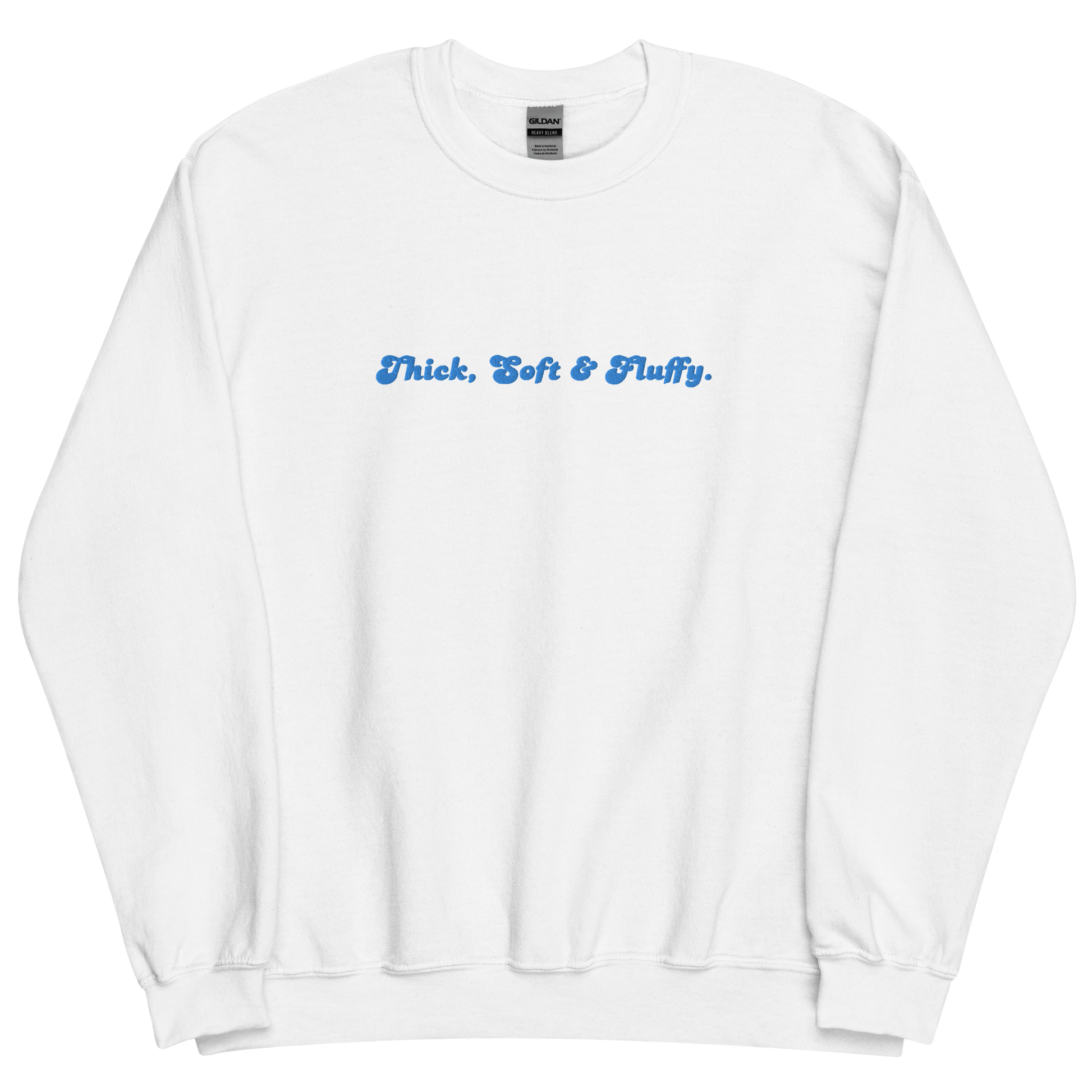 The sweater is just like the words across it - Thick, Soft and Fluffy. Sweater comes in white with multiple colors for the lettering. Thick, Soft and Fluffy. This sweater is cute and warm with quality embrodiery, as well as small Got Thick logo printed on the back. This item is limited. Get yours today.